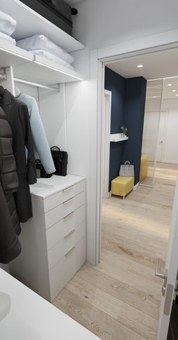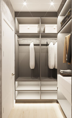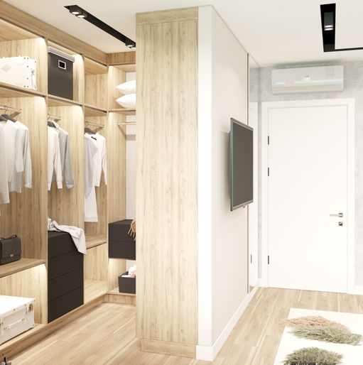 В гардеробі меблі не до стелі щоб лишити місце для валіз та несезонних речей в кофрах. Стійки втоплені для кращого огляду речей та щоб гардероб був не таким тісним. Є полиці для речей що не можна вішати та підсвітка більшості полиць. Є місце для довгих суконь та багато неглибоких висувних ящиків.