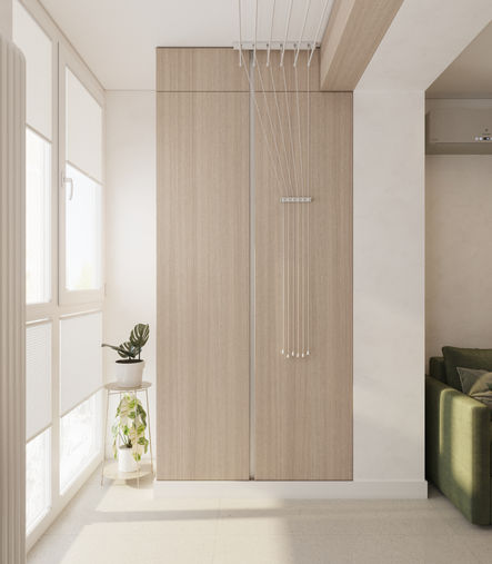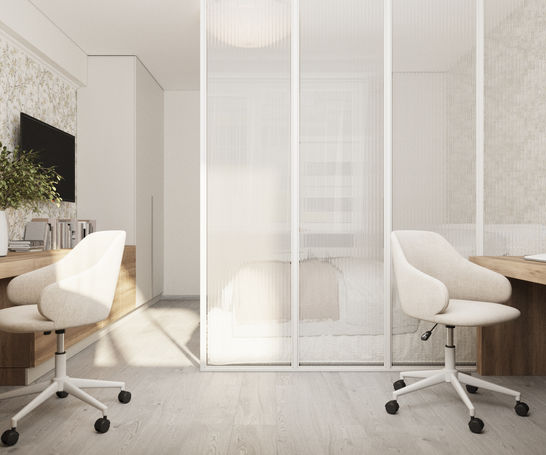 Також є зона гардеробу і щоб туди потрапляло світло, перегородку ми запроектували з флусу, що створює ефект переломлення світла і обриси предметів змінюються.