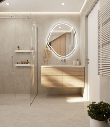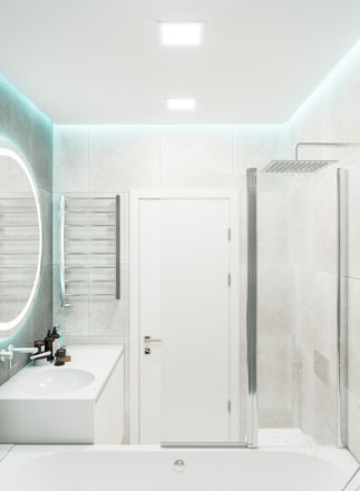В зоні умивальників витримали одну лінію закінчення дверей в кімнату та дзеркальних шаф👌