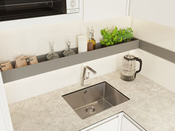 Верхні секції кухні виконали в кольорі стін, що візуально їх приховало, а полиці створили цікавий орнамент.