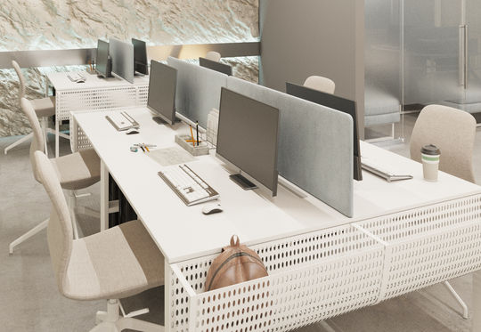 Всі робочі місця містять панелі-перегородки, щоб знизити рівень шуму та покращити комфорт. А також мають крило для особистих речей (сумки, маленького рюкзачка...)