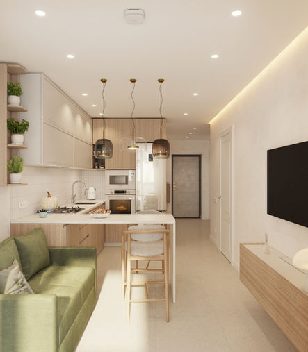 Фітозону в кухні-студії гармонійно поєднали з зоною ТБ.