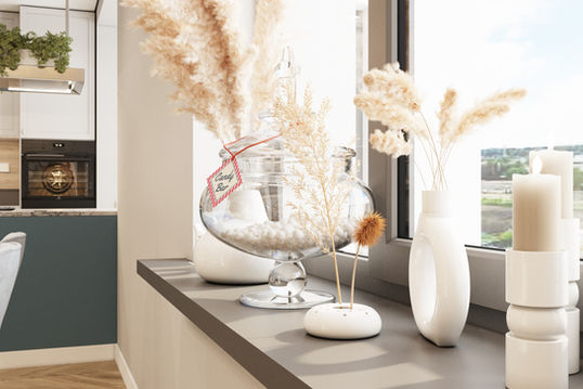 А дзеркальні панелі гармонійно завершують зону кухні та асоціюються зі струмками кришталевої води.