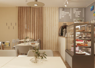 Смуги на стінах асоціюються зі смугами на еклерчиках і перекликаються зі шторами красивими біля одного зі столиків в якості декору.